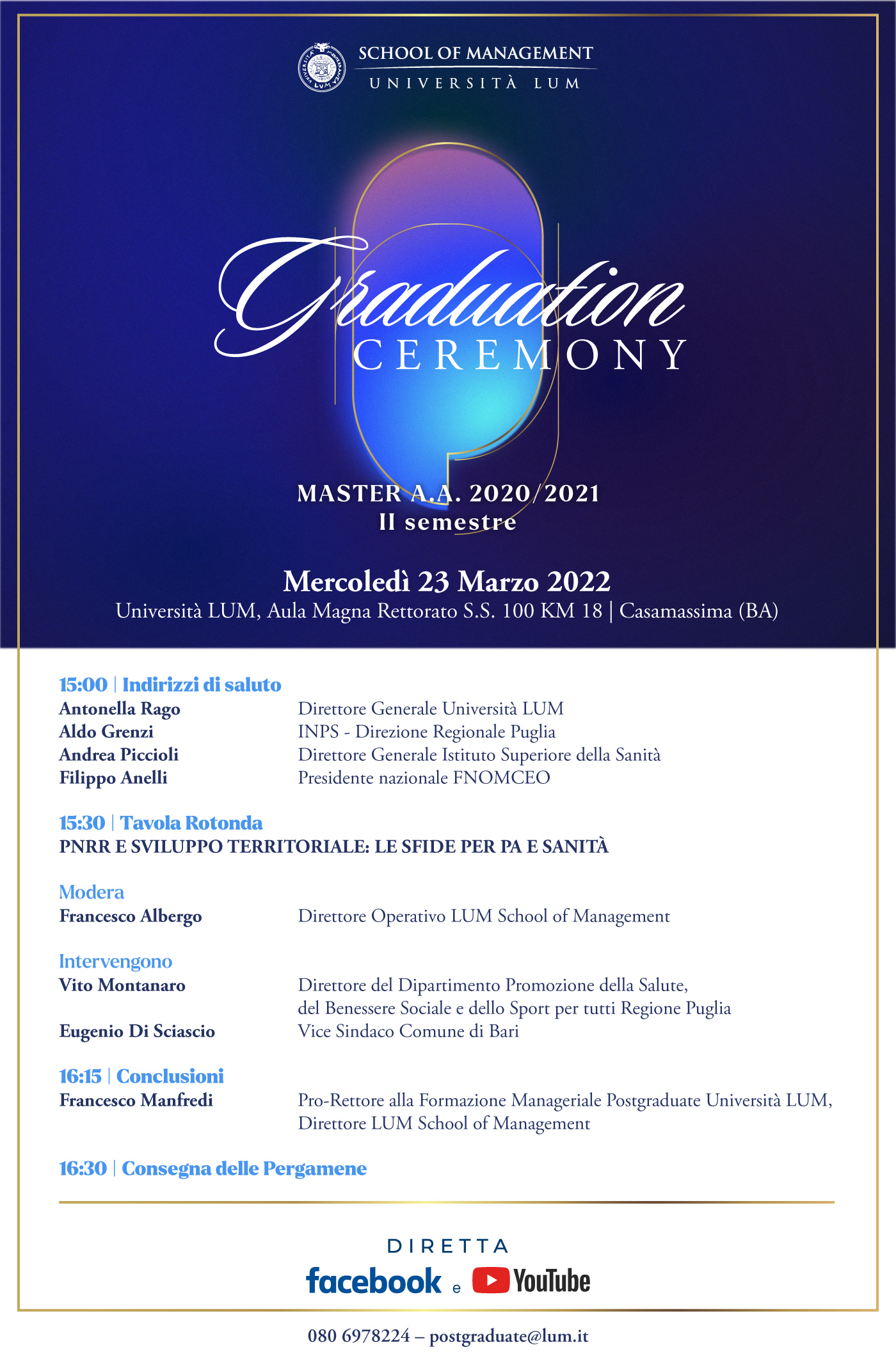 Anche quest’anno la School of Management dell’Università LUM ha deciso di offrire ai propri studenti un momento celebrativo, in coincidenza con la consegna del Diploma di Master con l’obiettivo di consolidare il rapporto maturato durante questo percorso.