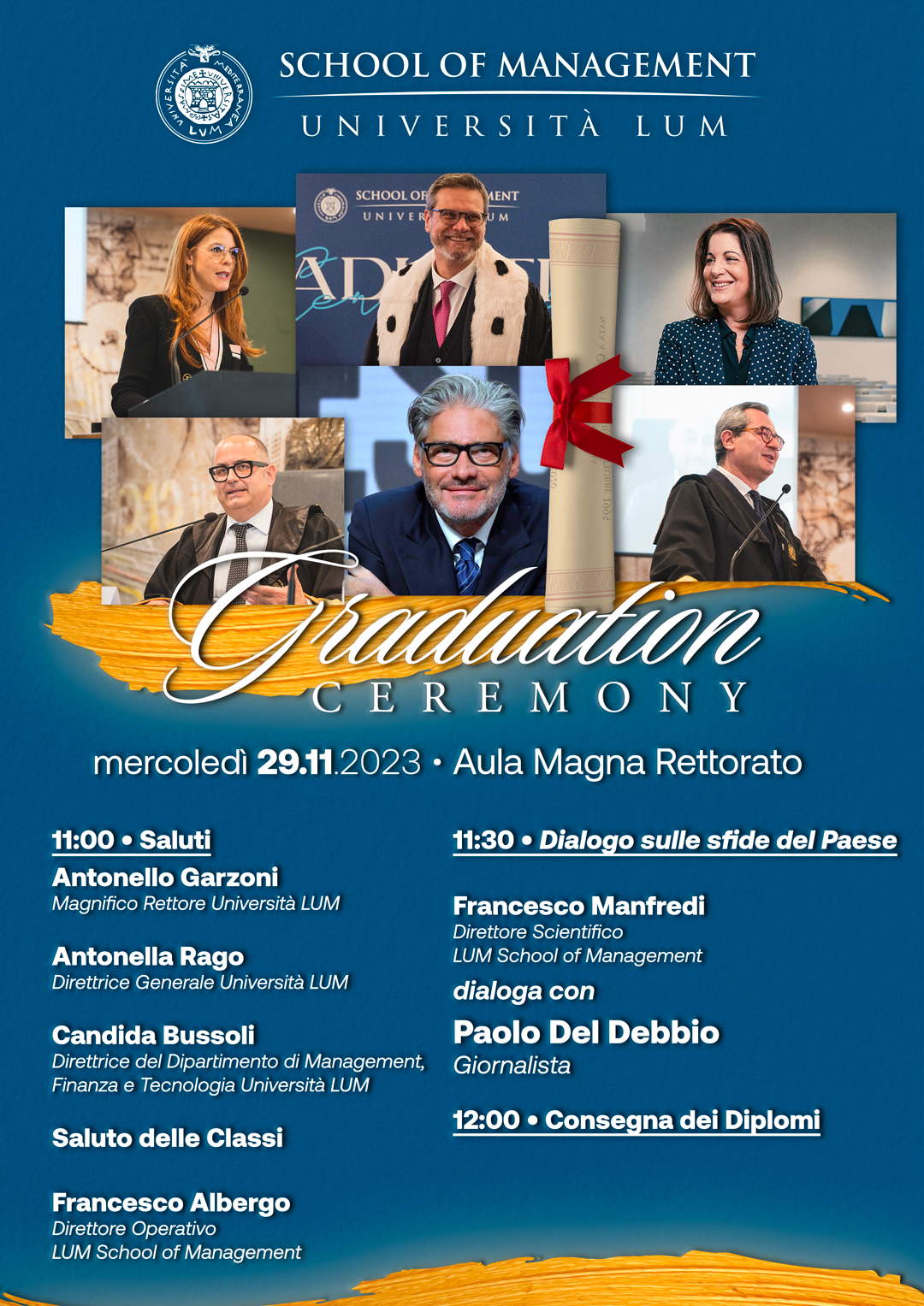 Anche quest’anno la School of Management dell’Università LUM ha deciso di offrire ai propri studenti un momento celebrativo, in coincidenza con la consegna del Diploma di Master con l’obiettivo di consolidare il rapporto maturato durante questo percorso.