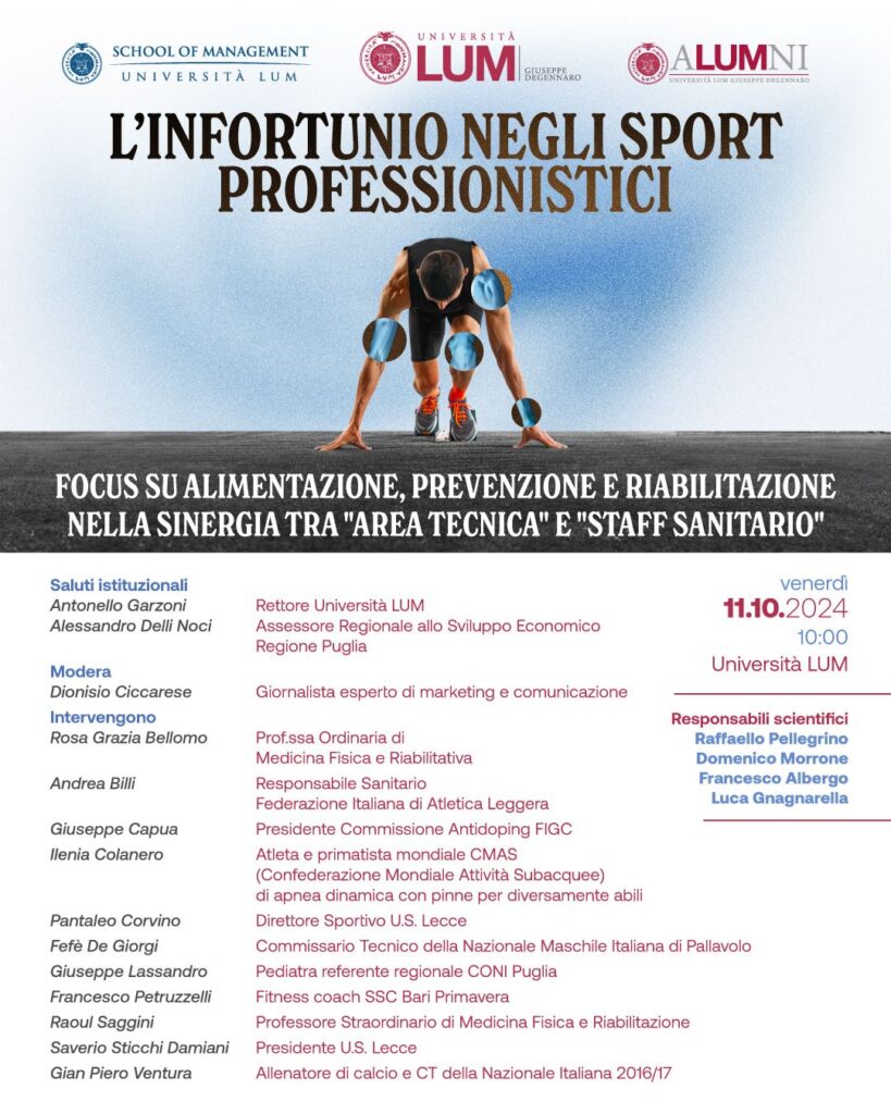 “L’infortunio negli sport professionistici. Focus su alimentazione, prevenzione e riabilitazione nella sinergia tra Area tecnica e Staff sanitario” è il tema del convegno in programma venerdì 11 ottobre dalle ore 10 presso l’Università LUM.