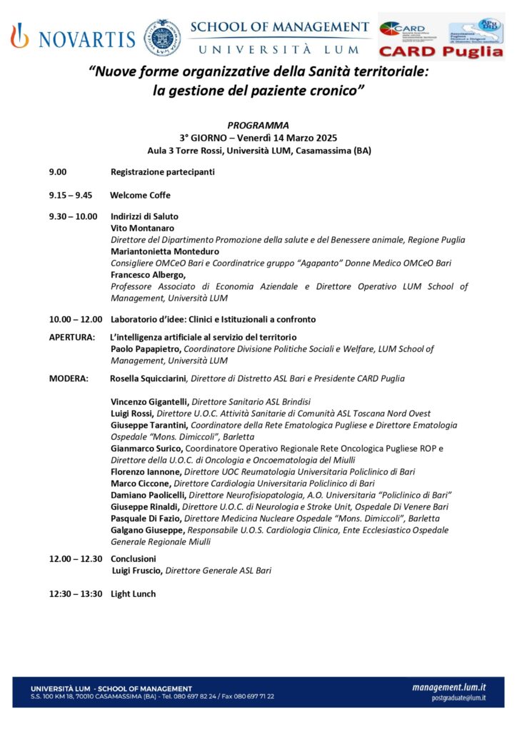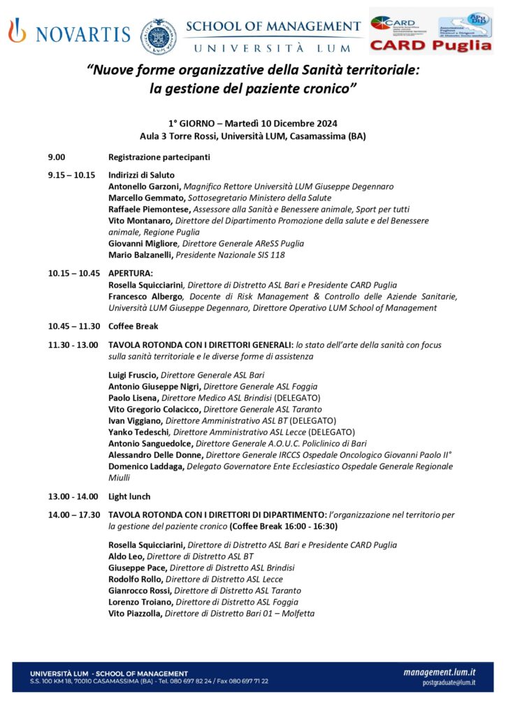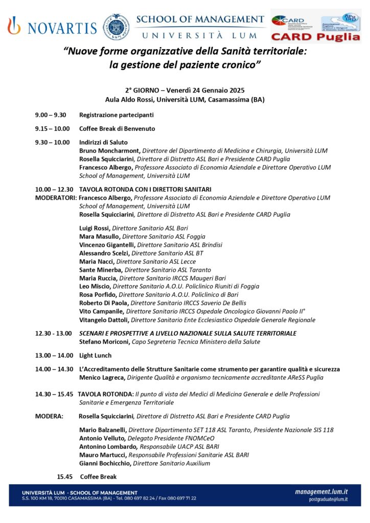 L’evento, che ha visto avvicendarsi tra i relatori direttori sanitari e direttori di dipartimento provenienti dalle più importanti aziende sanitarie pugliesi, si è articolato in due tavole rotonde, la prima dal titolo: Lo stato dell’arte della sanità con focus sulla sanità territoriale e le diverse forme di assistenza e la seconda su L’organizzazione nel territorio per la gestione del paziente cronico.